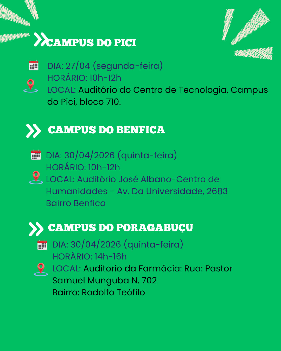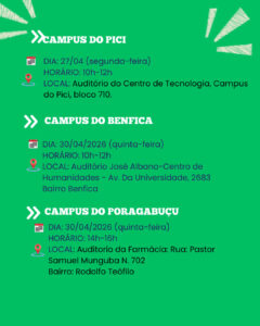 A Pró-Reitoria de Extensão convida os(as) extensionistas a participarem dos Seminários de Ambientação da Extensão, que serão realizados nos Campi de Fortaleza (Benfica, Pici e Porangabuçu).